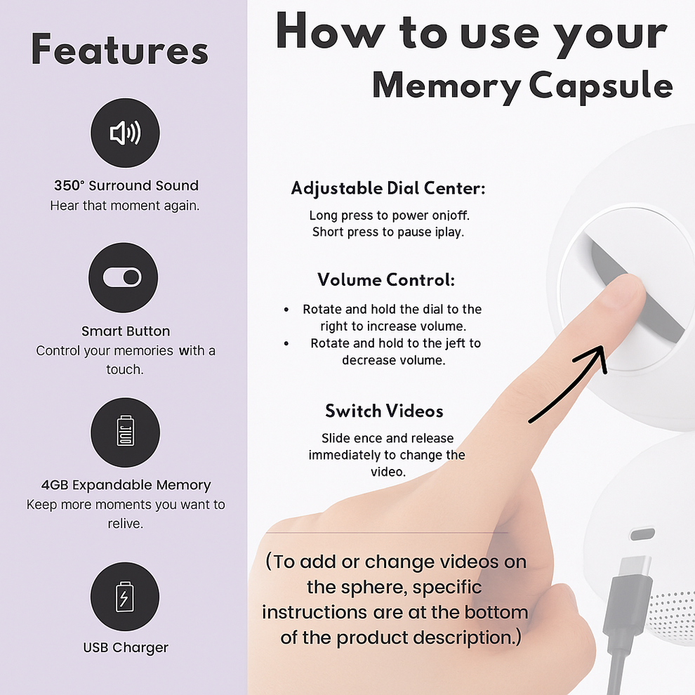 features a 2.1-inch high-resolution screen inside a luminous glass sphere, delivering vivid visuals and immersive video playback with sound